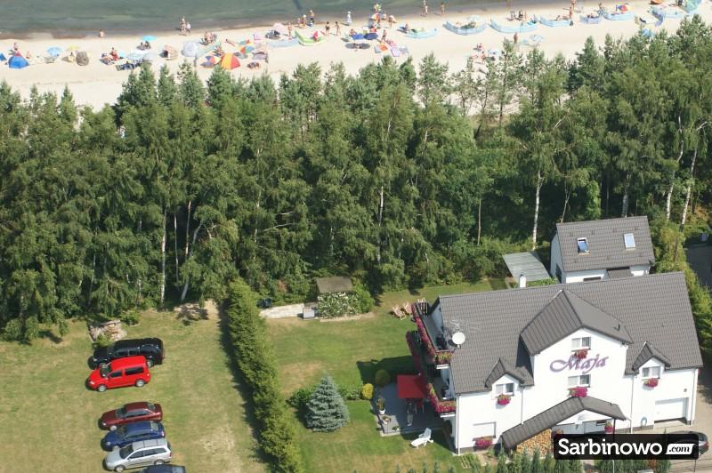 Na obszernej, przylegającej do wydmy działce, w odległości 30 m od morza usytuowany jest Villa Maja & Domek Maja. Do dyspozycji wczasowiczów, poza pokojami, jest sprzęt plażowy (parawany i leżaki) oraz ogród z możliwością grillowania.